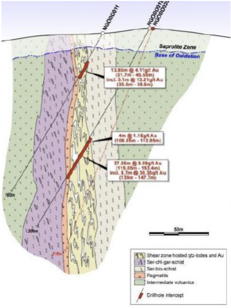 The Ngoy prospect is an inferred mineral resource estimate of 2 million tonnes at 3.3 g/t gold for 214,000 ounces of gold defined over part of the mineralisation which extends further in depth and area.